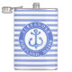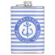 NewparkLane - Modern design, personalized flask, with a navy blue striped pattern and an anchor in a blue circular frame. Easy to customize with your name and favorite city. All text style, colors, sizes can be modified to fit your needs.