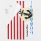 This baby blanket features a graphic of an anchor with a rope, a yellow and white striped sun and several lines of blue water waves all on a red and white striped background. Customizable text allows you to add a personal name.