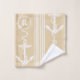 White nautical anchor with a rope encircling a monogram letter, flanked by stripes, is perfect for ocean inspired bathroom decor. The background has a beach sand color.