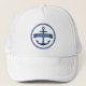 Trucker hat featuring a dark blue nautical anchor surrounded by a rope border. Across the anchor is a blue ribbon with a template field for your custom text. Default text "Captain".