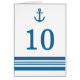 Elegant and classic Nautical Anchor Table Number Card with a simple boat anchor and an array of stripes in dark navy blue and white. This nautical beach themed wedding table card can be easily customized with your wedding details. For more customization options, click on the Customize It button.