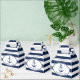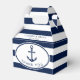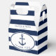 A fully customizable and fun treat box with a unique nautical theme. It features an anchor centered in the middle in a vibrant navy and white color scheme. Your text details circle around the edges. Bold navy stripes cover the backdrop.