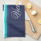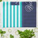 Nautical kitchen towerl with turquoise & navy blue striped pattern and customizable text.