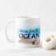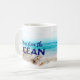 Nautical beach coffee mug gift/ocean advice coffee mug/advice from the ocean inspirational, motivational quote nautical coffee mug gift featuring the quote, “Advice from the ocean, be shore of yourself, come out of your shell, take time to coast, avoid pier pressure, sea life’s beauty, don’t get tide down, make waves” set on a beach background that is adorned with seashells.