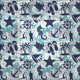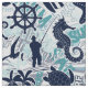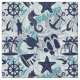 A fun summer collage of nautical elements and text including anchor, seagull, starfish and many more, all in navy blue with swirls and wave aqua blue accents. Create beach house or patio decor, beachwear or boating attire with this eye-catching new pattern. Search ID839 to see other products with this design and additional color options.