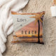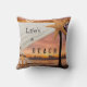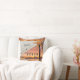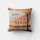 A modern scrapbook style pillow featuring different beach scenes with sand, a sunset, a surf and weathered wood with an anchor and starfish.
