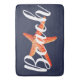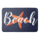 Coastal/nautical white "beach" script in white with a red starfish in the center over navy. Accent your modern beach themed bathroom with this plush and comfy bath mat.