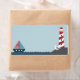 Nautical blank label, lighthouse guides a nearby ship, as a seagull watches from the rocky shore.