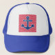 This nautical blue anchor hat makes a perfect gift for a sailor or boating enthusiast. The bold, blue anchor is outlined in white and set on a red chevron background. This is a perfect design for dad, mom, family member or friend. Make this a special gift by customizing it with a name, initials or boat name. Just click on "add text" to change the wording, font, size and color.