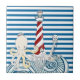 Bright blue and white horizontal pattern design ceramic tile with a nautical ocean theme features a red and white lighthouse, an octopus, white anchor, sea shell, and ocean waves!