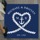 Nautical blue and white wedding floor decal. Great for a Navy (military) or lake house wedding. Design features a heart shaped rope with anchor and couple initials in the middle. Personalize it with your wedding details.