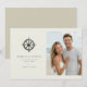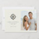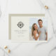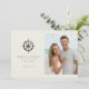 This wedding save the date features a split layout with a nautical theme, showcasing an antique ship's wheel on the left and a beach photo placeholder on the right. The design combines muted grays and browns with soft blues and whites for a serene, coastal vibe. Elegant serif and sans-serif fonts highlight the couple's names and event details, while the overall style blends classic motifs with modern simplicity. Perfect for couples who love the ocean, this template evokes joy and anticipation for their special day.