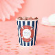 A simple navy blue and white striped pattern with personalized text. An ideal nautical theme design for a baby boy shower paper cup. Customize the text and make it your own. View matching items in this collection.