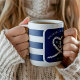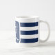 Nautical blue and white striped wedding mug. Great for a Navy (military) or lake house wedding. Design features a heart shaped rope with anchor and couple initials in the middle. Personalize it with your wedding details.