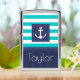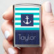 Nautical pocket lighter with turquoise & navy blue striped pattern and customizable text.
