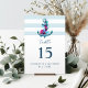 Add a coastal touch to your wedding decor with this nautical table card number design. Featuring an anchor with flowers on a blue and white stripes background, it's fully customizable. Perfect for beach and nautical-themed weddings.