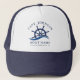 Nautical blue and white hat with a ship helm and ocean waves. Great outfit accessory for a yacht owner or any sailor. Personalize it by adding your name, your boat name and the city you set sail in.