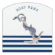 This image features a boat name and anchor on a navy blue and white striped background.