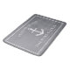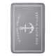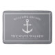 A custom bath mat tailored to the proud boat owner. It features a nautical vintage anchor followed by the boat name and the boat captain's name and the home dock location. All of this sits against a soft slate grey colored backdrop to compliment your bathroom.