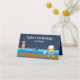 This cute and fun place card features a nautical sailor boy monkey on a wooden deck with a seagull and a crab. In the background there is a red and white lighthouse, a cute bird on a sailboat, ocean waves and a navy blue starry night sky. The text combines bold and serif fonts for a stylish and modern look. This is perfect for a nautical themed birthday party.