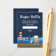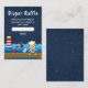 This cute and fun diaper raffle enclosure card features a nautical sailor boy monkey on a wooden deck with a seagull and a crab. In the background there is a red and white lighthouse, a cute bird on a sailboat, ocean waves and a navy blue starry night sky. The text combines bold and serif fonts for a stylish and modern look. This is perfect for a nautical themed baby shower.