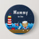 This cute and fun baby button can be personalized with a title such as mommy to be, grandma to be, auntie to be etc. It features a nautical sailor boy monkey on a wooden deck with a seagull and a crab. In the background there is a red and white lighthouse, a cute bird on a sailboat, ocean waves and a navy blue starry night sky. The text combines bold and serif fonts for a stylish and modern look. This is perfect for a nautical themed baby shower.