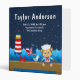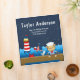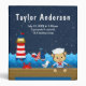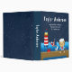 This cute and fun binder features a nautical sailor boy monkey on a wooden deck with a seagull and a crab. In the background there is a red and white lighthouse, a cute bird on a sailboat, ocean waves and a navy blue starry night sky. The text combines bold and serif fonts for a stylish and modern look. It can be personalized with your baby's birth stats, such as name, size, date and time of birth, or if you would like to give it as a shower gift you are able to edit and remove text.