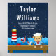 This cute and fun poster features a nautical sailor boy monkey on a wooden deck with a seagull and a crab. In the background there is a red and white lighthouse, a cute bird on a sailboat, ocean waves and a navy blue starry night sky. The text combines bold and serif fonts for a stylish and modern look. It can be personalized with your baby's birth stats, such as name, size, date and time of birth, or if you would like to give it as a shower gift you are able to edit and remove text.