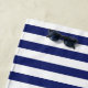 Personalize this nautical Captain's beach towel with your name. Design features a drawing of a navy blue anchor with rope in the center and navy blue and white stripes above and below.