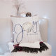 Nautical Christmas Joy Seashell Holiday Throw Pillow featuring elegant yet rustic typography of Joy with a watercolor seashell as the "o" on a background of coastal white wood.