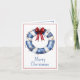 These cute coastal inspired note cards feature a nautical blue and white life preserver wreath decorated with a red bow and Christmas lights. Personalize with your choice of special holiday text on the front and inside.