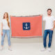 Trendy nautical design of coral polka dots with navy blue banner in the middle with white anchor.