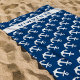 Personalize this stylish modern nautical beach towel with your name, featuring a white anchor pattern on a navy blue background. The pattern can be resized so the anchors can be smaller or larger, so is customizable the background color and the color of text.