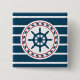 Nautical design with sailing wheel decoration in round shape on blue and white striped background
