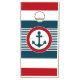Nautical design with anchor decoration in round shape on blue, red and white striped background