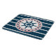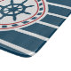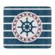 Nautical design with sailing wheel decoration in round shape on blue and white striped background
