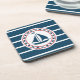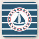 Nautical design with sailing boat decoration in round shape on blue and white striped background