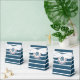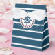 Nautical design with sailing wheel decoration in round shape on blue and white striped background