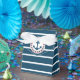 Nautical design with anchor decoration in round shape on blue and white striped background