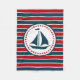 Nautical design with sailing boat decoration in round shape with stars on red, blue and white striped background