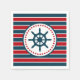 Nautical design with sailing wheel decoration in round shape with stars on red, blue and white striped background