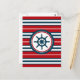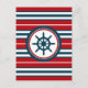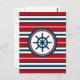 Nautical design with sailing wheel decoration in round shape on red, blue and white striped background