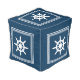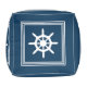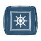 Nautical themed design with sailing wheel decoration in striped squares on blue background