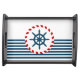 Nautical design with sailing wheel decoration in round shape on blue and white striped background