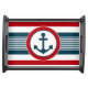 Nautical design with anchor decoration in round shape on blue, red and white striped background