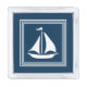 Nautical themed design with sailing boat decoration in striped squares on blue background