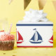 Nautical design with sailing boat and compass decoration on red, blue and white striped background