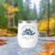 These nautical navy blue and white thermal wine tumblers are perfect for your family cruise vacation, and feature a stylized ship’s wheel with ocean wave.