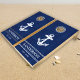 The rustic lake house themed cornhole set features a blue wood background, and it can be customized with your family's name and established year, below the anchor graphic on the design.
