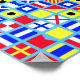 This colorful collection of signal flags adds a nautical touch to any room. The background can be user-defined (we recommend light blues or grays). When these flags are decoded into their corresponding letters, they form a word-search puzzle related to ships and boats. There are 13 words: "nautical","captain,"bow","stern","port","starboard", "compass","sail","captain","ship","sail", "knot", and "anchor". Smooth sailing!